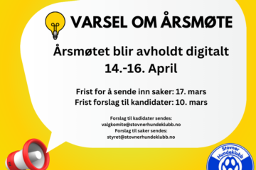 Årsmøtet vil bli gjennomført digitalt over tre dager, slik at alle har mulighet til å delta. Mer informasjon om plattform vil komme. Forslag til kadidater sendes: valgkomite@stovnerhundeklubb.no Forslag til saker sendes: styret@stovnerhundeklubb.no